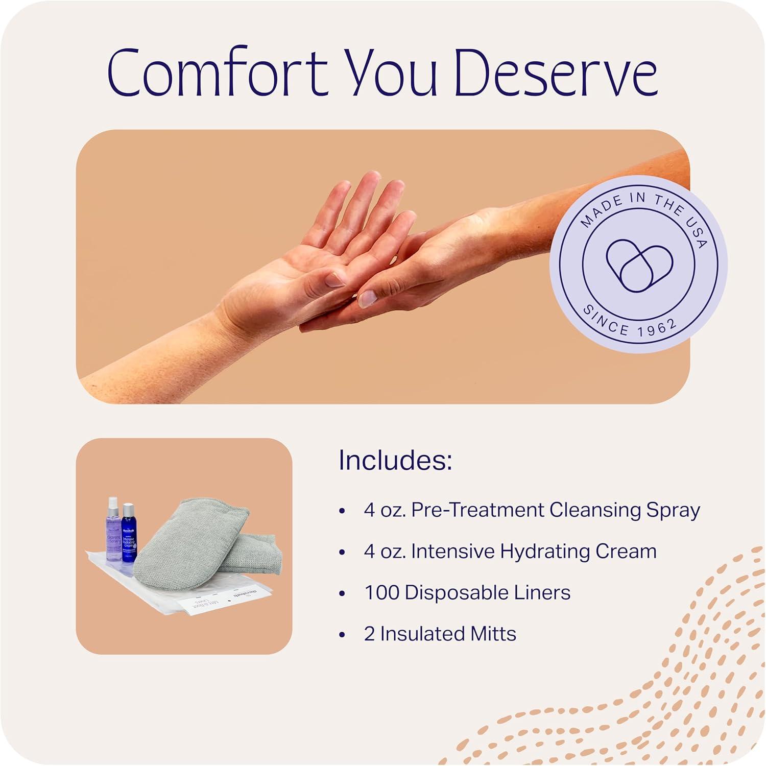 Comforting Relief. The Therabath Hand ComforKit helps to enhance your paraffin wax bath with accessories that will elevate your experience, including insulated hand mitts for warm comfort, plastic liners for easy cleanup and application, a cleansing spray, and a hydrating moisturizing cream for daily skin maintenance.